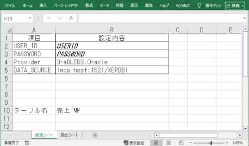 ・オラクルへインサートするデータは、シート2に作成しておきます。