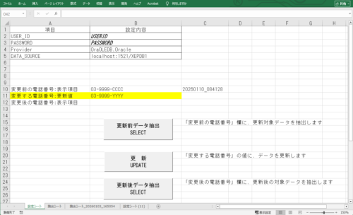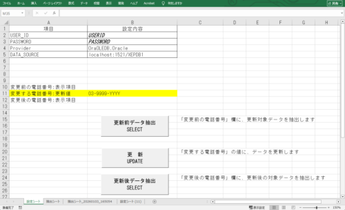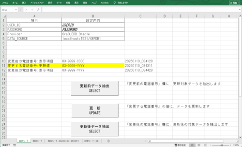 Excel-VBAにて、ExcelのセルにセットしたデータをORACLEデータの特定項目へ更新するプログラムを作成しました。